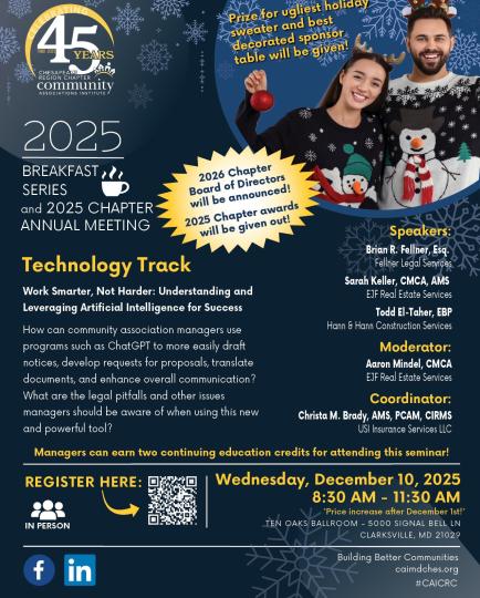The Chesapeake Region Chapter of CAI is a non-profit organization that hosts educational programs for homeowners (board members and community volunteers), community managers, and business partners such as landscapers, roofers, etc. to teach best practices in running and servicing condominiums, homeowner associations, and cooperative communities. We also provide social opportunities for sharing best practices amongst homeowner members and networking for property managers and business partners.